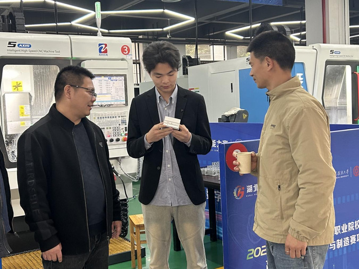 互动交流环节后,丁立芳走进专业实训室开展现场教学。他利用数控专业实训设备,围绕数控加工操作、零件装夹定位、精度控制等关键技能进行手把手示范讲授,把课堂理论与企业一线实操紧密结合,直观展示工匠技艺与严谨作风。