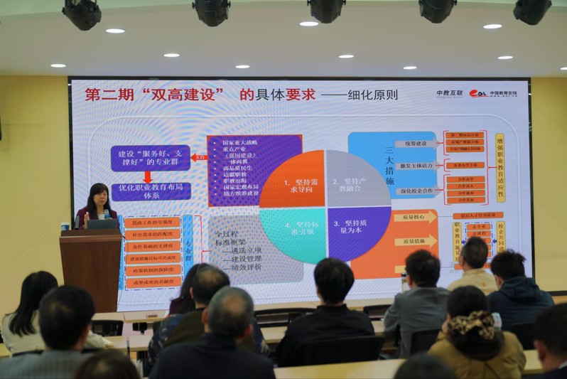 整场讲座重点剖析了“新双高”建设的十大重点任务,并结合职业教育发展新形势与典型院校实践案例,深入浅出地讲解了各项任务的建设目标、建设任务和建设措施。并详细介绍了新一轮双高建设以“六个度”为核心的评价标准体系,即思政工作引领度、社会需求匹配度、条件基础支撑度、目标措施可达成度、政策机制保障度、成果成效贡献度。参会教师认真聆听、仔细记录,纷纷表示讲座内容观点鲜明、内容详实,具有很强的针对性、前瞻性和指导性,为自身教学研如何推进“新双高”建设提供清晰思路与实操方案。